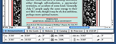 Figure 3: At the bottom of the document window, you’ll see new layout tabs — these show all the documents contained in the XPress project file. You can also see that the formatting palette has gotten bigger and taken on the Aqua look.