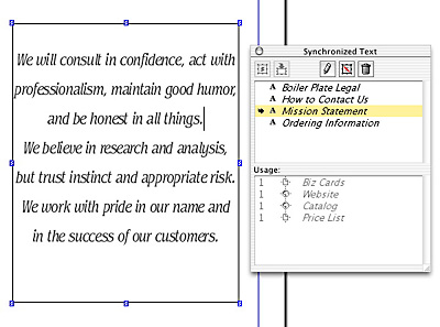 Figure 4: The Synchronized Text palette is where you store and insert text that will be synchronized throughout the document. You can see all the usages of any synchronized text box in a list, but you can’t navigate to each use through the palette. Once text boxes are synchronized, changes made in any of the boxes makes the changes in all the linked boxes.
