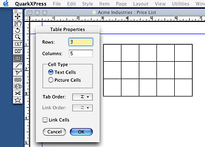 Figure 6: Tables are improved in 6.0, but still considerably behind those of InDesign. Here the Table Properties dialog box asks for only the most basic information. The table creation tool is the multi-boxed item highlighted in the toolbar.