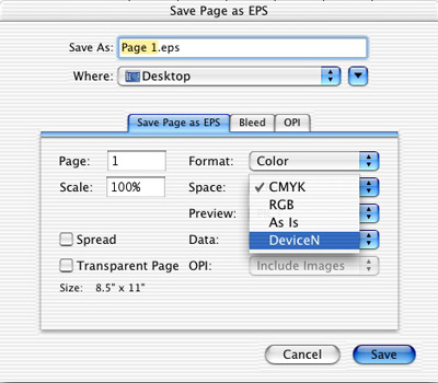 Figure 10: Quark has added color options when printing, saving PDFs, or writing to EPS. The As Is and DeviceN options improve the ability to work in both separated and composite colors. However, you can still not embed fonts in EPS files.