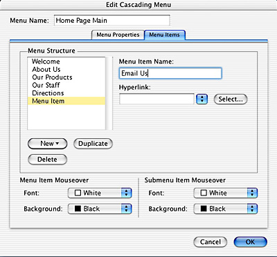 Figure 11: The Web layout tools have improved in 6.0, but are still behind those in more popular Web authoring programs. Here, the new Edit Cascading Menu dialog box. Xpress 6.0 also has rollovers now, but you can’t print HTML layouts from within XPress.
