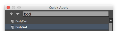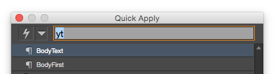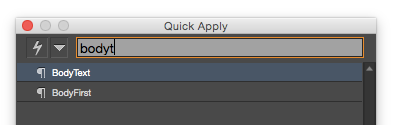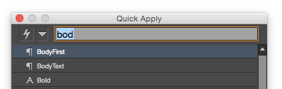 But even more annoying is the fact that it seemingly doesn’t always remember the last thing you applied. That’s supposed to be a feature, one of the things that makes Quick Apply so quick. If you apply a paragraph style like BodyText with Quick Apply, the next time you press Command+Return/Ctrl+Enter, BodyText is supposed to be already selected in the panel, so you can just hit Enter and instantly apply BodyText again. Only sometimes it isn’t highlighted in the panel. Here’s why: