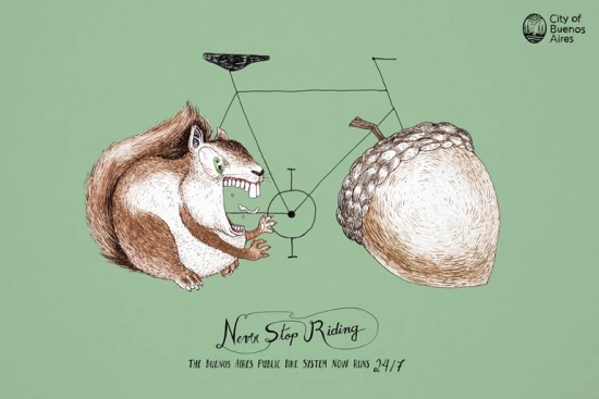 Billed with the tagline, “Never Stop Riding,” the fun hand-drawn graphics tout the 24/7 availability of the city’s stable of community bikes. Buenos Aires propelled their program from a mere three stations to 200 in just five years.