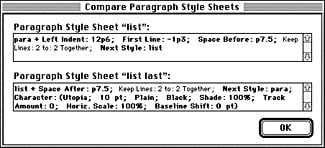 I hate it when I have two styles that are very similar but I can’t remember how they’re different. Fortunately, QuarkXPress lets you compare two style sheets. Select two styles in the Style Sheets dialog box (click on one, and then Command-click on the other), then Option-click the Append button. (Actually, as soon as you hold down the Option key, you’ll see the Append button change to a Compare button.) The result: a dialog box that lists each element of the two style sheets; the differences are highlighted in bold (see figure 1). Of course, you can only compare two character styles or two paragraph styles; you can’t mix and match.