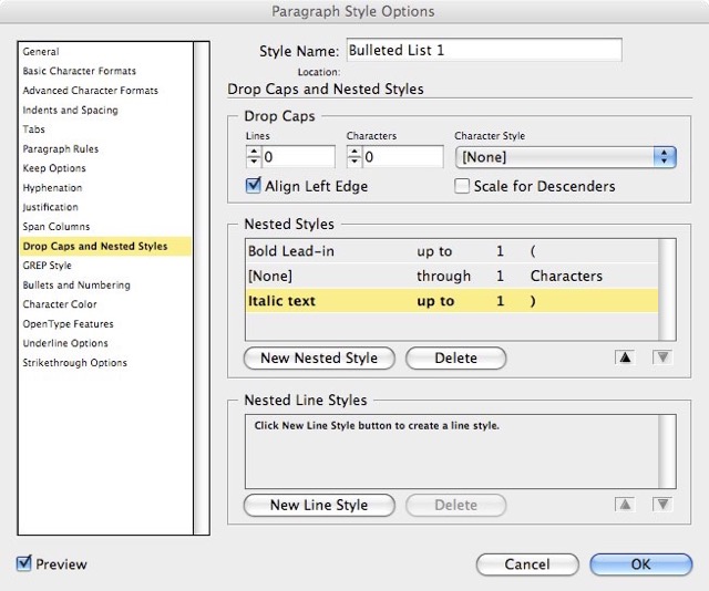 Figure 5: A third nested style tells InDesign to format text preceding a closing parenthesis with the Italic character style.