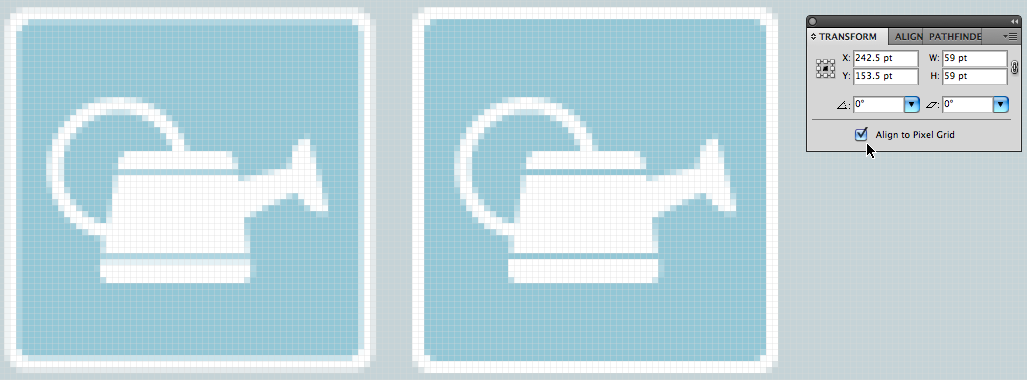 Figure 8: With the Align to Pixel Grid setting in the Transform panel, a click of your mouse turns soft and blurred artwork (left) into designs that appear sharp and clear on digital displays (right). Click the image below to open a larger version in a separate window.