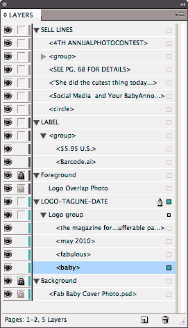 Figure 8. InDesign CS5’s rebuilt layers panel assigns every object a name. Defaults like “group” and “rectangle” are automatic, placed images bear the original file’s name, and text frames are named with their first 32 characters. You can change any of these object names by triple-clicking its name in the panel.