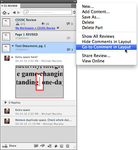 The CS Review commenting interface is deliberately simple, allowing for call-outs and text comments which are immediately recorded to the online review and available instantly in InDesign’s CS Review panel (provided you’re online, of course). You can select any comment in the review and, from the CS Review panel menu, jump right to where the content in question appears in the InDesign document (Figure 17).