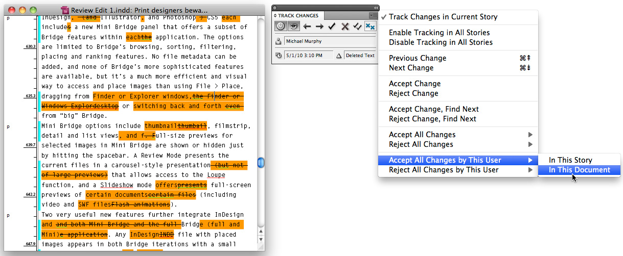 Text Track Changes. Do you love the idea of tracking changes but don’t want to set up an InCopy workflow to do it? InDesign CS5 solves that dilemma by building in track changes. This is a text-only feature, however. It won’t track that someone re-sized an image or deleted a Master Page item, nor will it show you the change activity in the layout. You only see marked-up changes and details about who made them in the Story Editor (Figure 16).