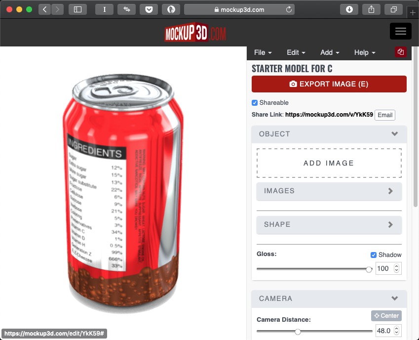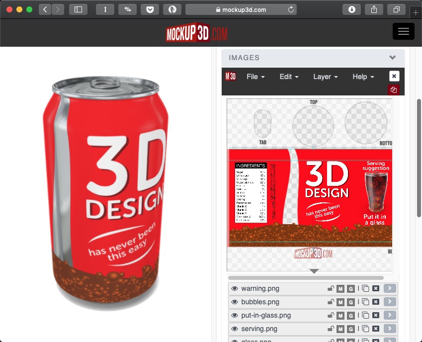 This is where it all starts. You’re presented with a range of models including cans, bottles, bags, boxes, cartons, caps and T-shirts. It’s a small selection at the moment, but it’s sure to expand in the future. For this example, I chose a soda can. To make the design process easier, you can download a template that will aid in assembling the artwork in Photoshop.