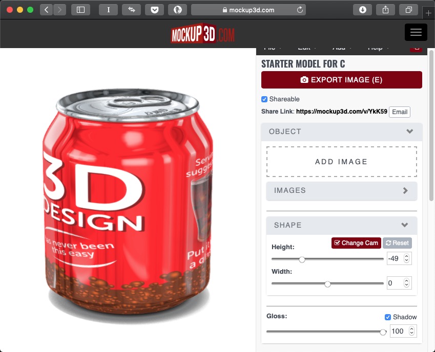 Use the Export Image button at the top of the screen to save the image in either PNG or JPG format to your computer. The exported image is limited to the size at which it appears in your browser window, so the resolution is limited to the size of your monitor. You can also share a link to the spinnable model so others can view it in 3D in a browser window – and you can check out this model here.