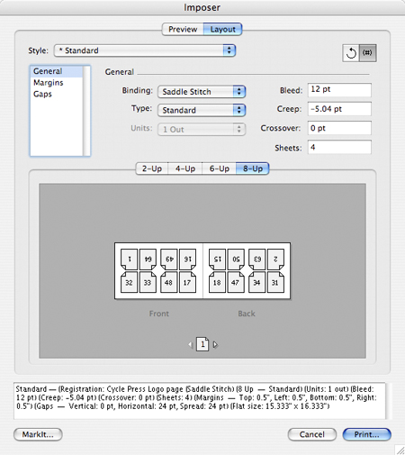 Figure 2. Imposer’s main window provides a correct view of the imposition with all page numbers shown accurately. (You can set Page 1 on any appropriate starting page.) Notice the setting for –5.04 pt. creep adjustment, which causes the image on each succeeding form to move inward by a small amount to compensate for paper thickness in the gutter.