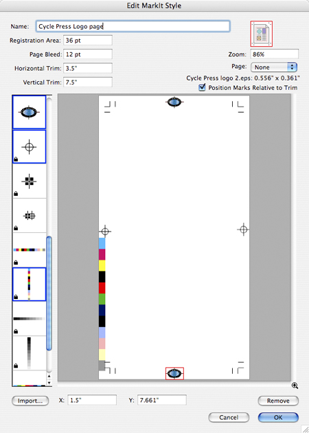 Figure 4. The MarkIt XTension offers stock color bars, register marks, and grayscale ramps. I imported an EPS illustration to customize my layout with a printer’s logo (elliptical mark top and bottom). You can access the MarkIt tools work in QuarkXPress, but not in Acrobat. To see a larger version of this image, click on it.