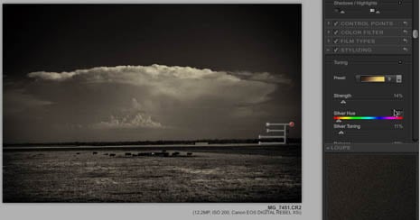 With the Stylizing controls, you can create several important darkroom effects. Toning lets you apply a color tone to your image, which can be used to create everything from old-style sepia tones to more stylized color tonings.