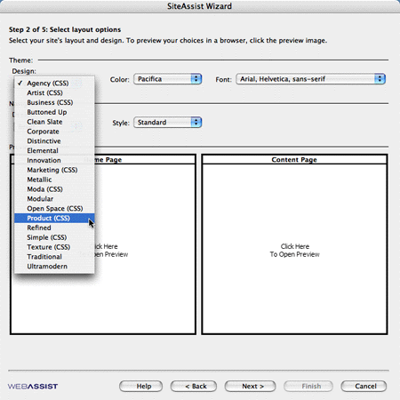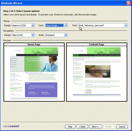 SiteAssist ships with 20 professionally designed templates and color schemes with matching graphic elements (Figure 2). The first step is to choose a design for the Home Page. Beware that only about half of the page layouts and seven of ten navigation layouts offer CSS versions.