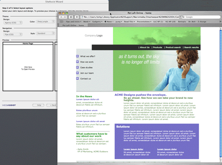 The Windows XP version of SiteAssist ties tightly into the built-in browser, while the Mac preview is offered (albeit at full real-time size and clickability) in a separate browser window. This is a small annoyance from the usability perspective, but when the application’s aim is to provide a speedy selection process between twenty layout options, ten navigation options, four capitalization choices, and eleven colors, those clicks add up.