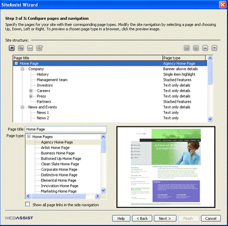 In what amounts to a mini-sitemap, Step 3 of 5 of the wizard lets you apply layout choices to individual pages within the various sections of the site that you determined in step 1 (Figure 4).