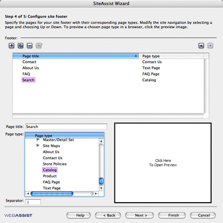 Step 4 of the process is for building the footers of your site and assigning different page orders and design templates to the different types (Figure 5). It seems a bit much to devote a whole dialog box to generating footers, but SiteAssist offers its full gamut of options for the pages listed in the footer as well.