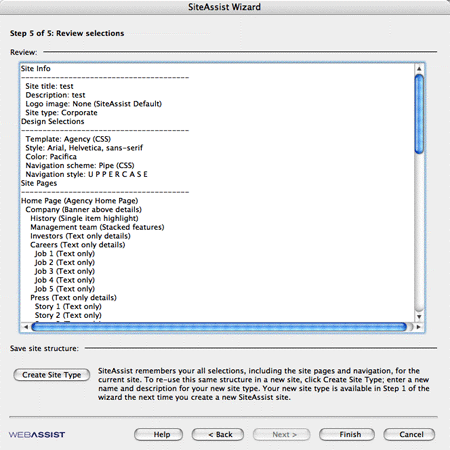 SiteAssist then auto-generates the content pages based on your template choice’s characteristics. Additional formatting choices include color schemes in a range of dark pastels; the standard Dreamweaver font ranges; ten options for the navigation look-and-feel; and capitalization options (lowercase, UPPERCASE, U P P E R C A S E, and Standard).