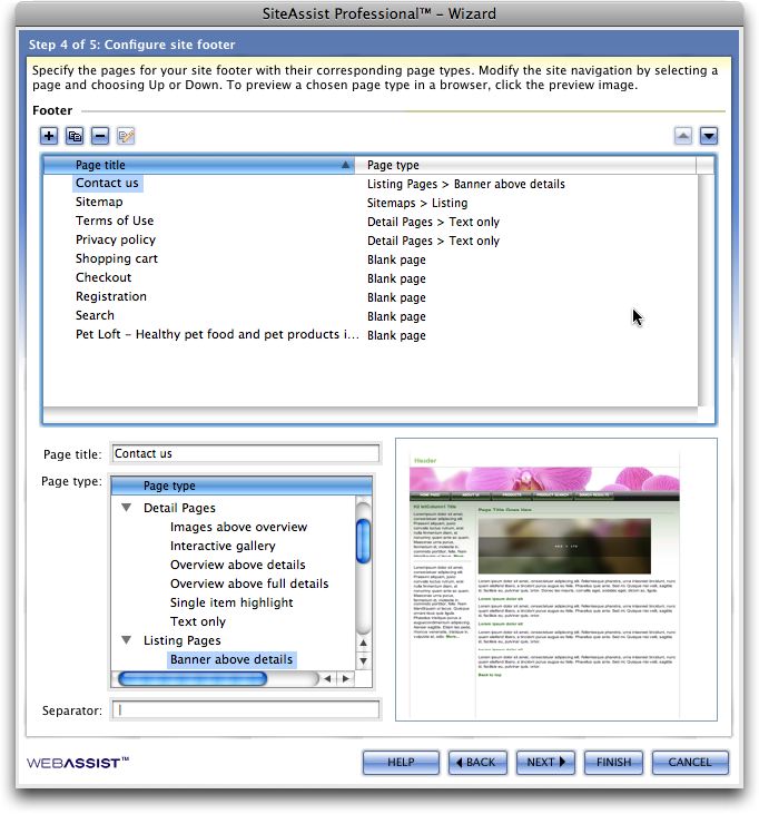 Figure 2. Live previews offer generous thumbnails for the index and one internal page so you can get a feel for what suits your fancy. SiteAssist’s Vista-like buttons might not sit well with Mac users. Click on the image to see a larger version.