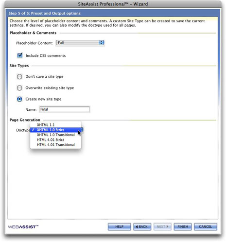 Additionally, this is where you tell SiteAssist what kind of site you want to build. Your choices include different flavors of XHTML and HTML. My advice: Choose the coding strategy with which you’re most comfortable, but stick with its “Strict” interpretation for greater browser compatibility and easier portability.