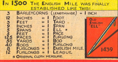It wasn’t until the 16th century that the rod was established as the length of the left feet of the first 16 men out of church on a certain Sunday. Why there weren’t better standards the booklet does not explain — it doesn’t seem like it would have been that hard to make one master measurement tool and then duplicate it for consistency.