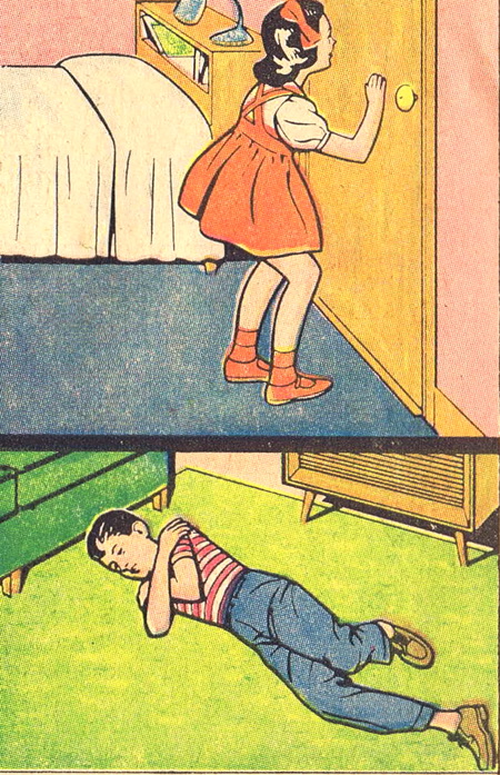 Teaching kids about fire safety is an age-old process and local fire departments often supply schools with educational pamphlets on the benefits and dangers of fire. We all learned about the combination of heat, fuel, and oxygen that leads to fire, and what to do in case of fire in the home or elsewhere. Today’s images all come from two fire-prevention pamphlets produced by The National Board of Fire Underwriters, a group of insurance companies. Click on any image for a larger version.