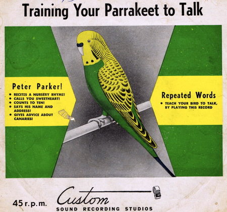 And even though cockatiels and parakeets are among the varieties that can mimic speech, I could never coax the birds in my house to say anything. I have met several talking birds in my time and of course seen them on TV. Here is art from two 1952 45 RPM records produced to help teach your bird to talk.