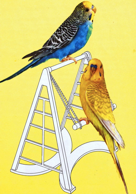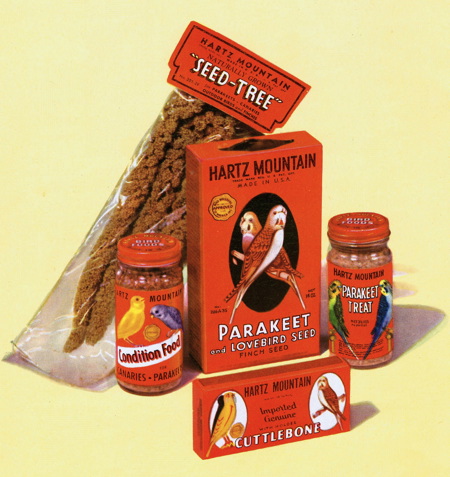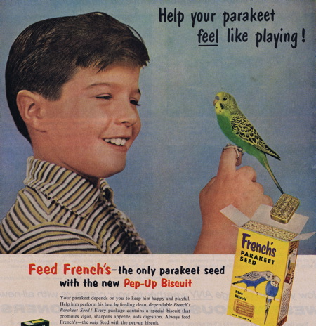 So today I thought I’d look at some pet-bird advertising and art, mostly focusing on the smaller varieties such as canaries and parakeets. Click on any image for a larger version. These first three images are from 1953.