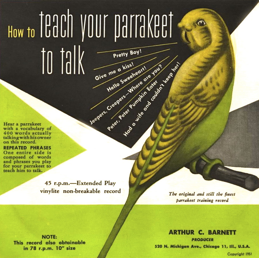 And even though cockatiels and parakeets are among the varieties that can mimic speech, I could never coax the birds in my house to say anything. I have met several talking birds in my time and of course seen them on TV. Here is art from two 1952 45 RPM records produced to help teach your bird to talk.