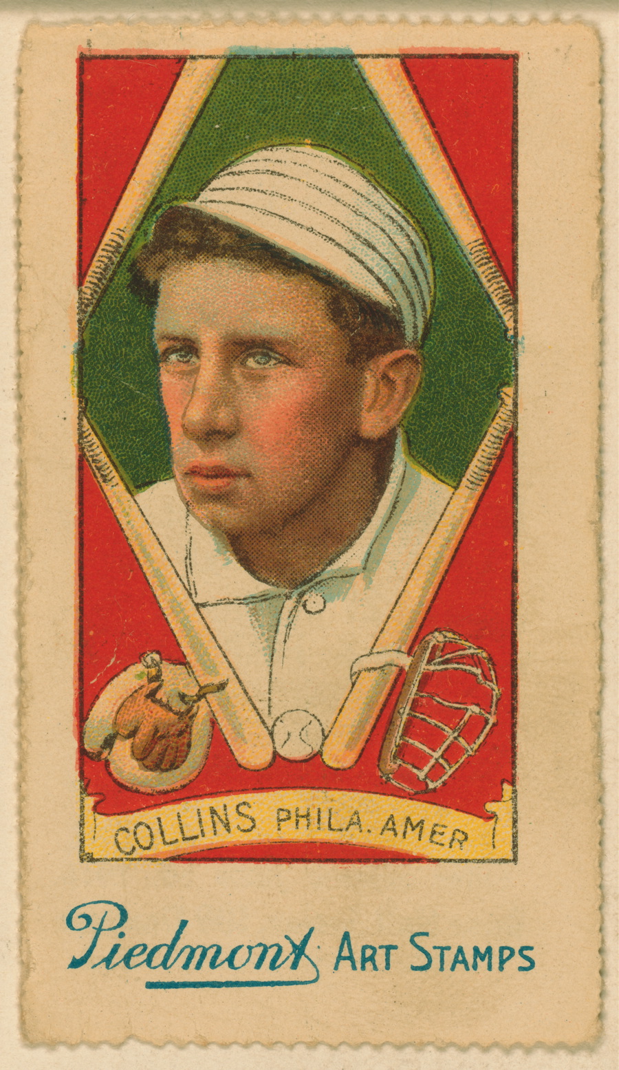 For all of the cards pictured here, the photographs were strictly black and white — any color was added by hand-tinting. Here is a version from 1914 of Eddie Collins of the Philadelphia Athletics, and two from 1911 and the Helmer Tobacco Company.