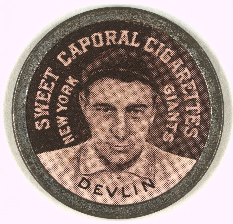 Cards came in different sizes and shapes, depending on the item being packaged. I don’t know when they started combining baseball cards and gum. Here’s a round card of Art Devlin of the NY Giants (1909-1912) and horizontal cards from 1909-1911.