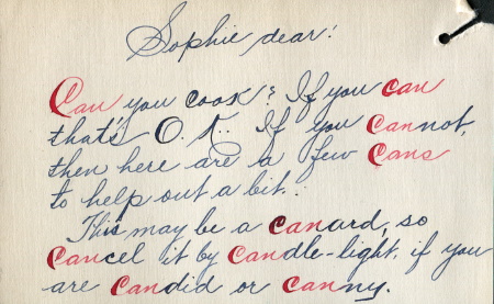 One of the hosts of Sophie’s shower chose a grocery theme and encouraged the attendees to bring food items with funny labels, which they did in great number. As you can see from these examples, 1936 was not a terrific year for humor. But Sophie dutifully wrote the package contents on the label so you can join in on the jokes 73 years later.