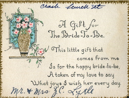 That was certainly the case back in 1936, when our bride-to-be Sophie was given several different showers by her friends. She meticulously chronicled the events and described each gift on the card that accompanied it.