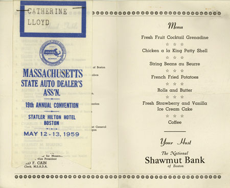 And here’s a menu, complete with Chicken a la King and Fruit Cocktail courses, from a 1959 meeting of the Massachusetts State Auto Dealer’s Association.