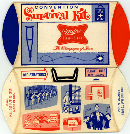 Of course attending conventions isn’t all about the badge or the business at hand. While I’ve never seen it myself, conventions are famous for the extra-curricular activities that are supposed to take place. So these images, from a special “Convention Survival” kit distributed by Miller Beer, play off that idea. Inside the kit was aspirin, a band-aid, Alka-Seltzer, and assorted other remedies for excessive partying.