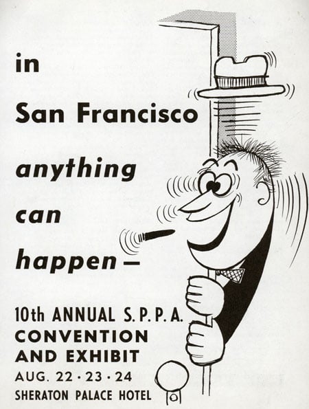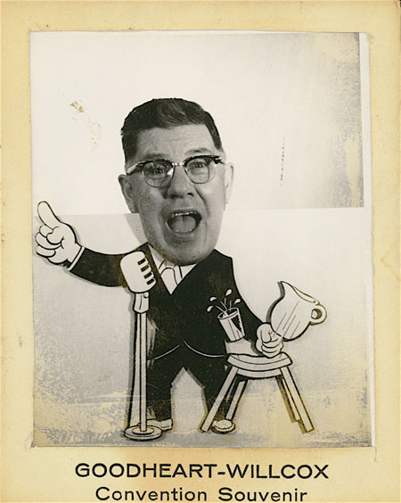 Though I’m sure participants in both recent political conventions behaved admirably, there is something about attending an out-of-town event that makes people want to act goofy. This souvenir photo that I picked up at a garage sale is typical of some of the take-always provided by exhibitors and sponsors at conventions of old.