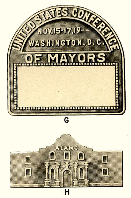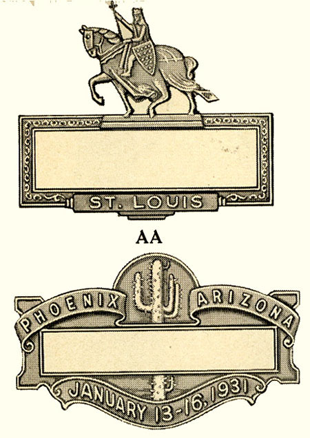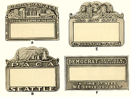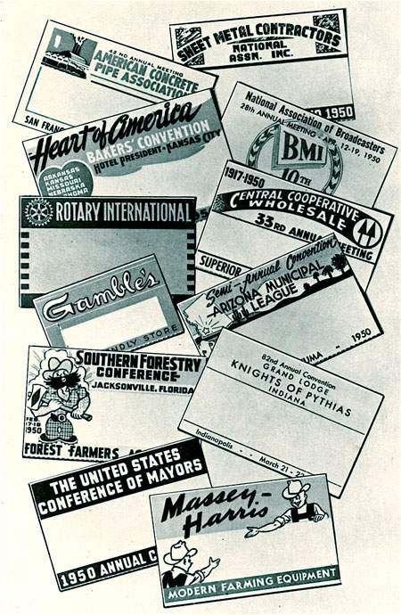 As shown in these stock metal badges, convention centers, city tourism bureaus, and other entities often provide blank stock that can be used for those events without sufficient budgets to create badges of their own.
