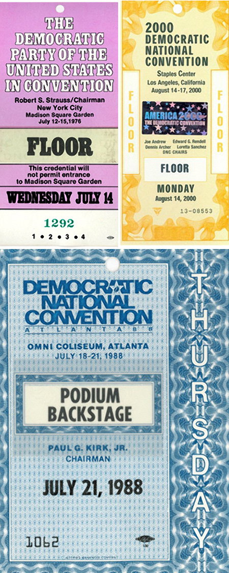 I couldn’t come up with examples of the Republican political convention credentials, but I did come up with these examples from past Democratic conventions. These days, I’m sure that security requirements have upped the ante on credential design.