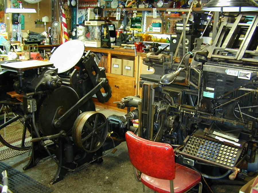 I began this column as an attempt to chronicle the set up of a vintage letterpress print shop in my garage – a “gift” my wife Patty bought me on eBay and for which I had high hopes. Here’s a picture of the Russian Orthodox priest who owned the shop before me, and a couple of views of my garage set-up, which made for good pictures, but not much in the way of actual printing.