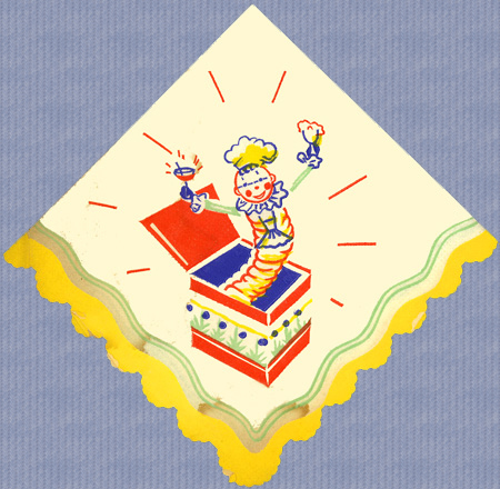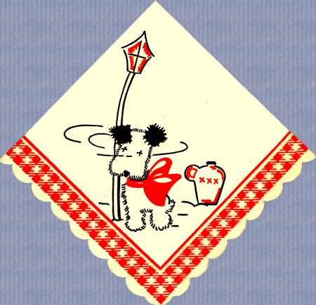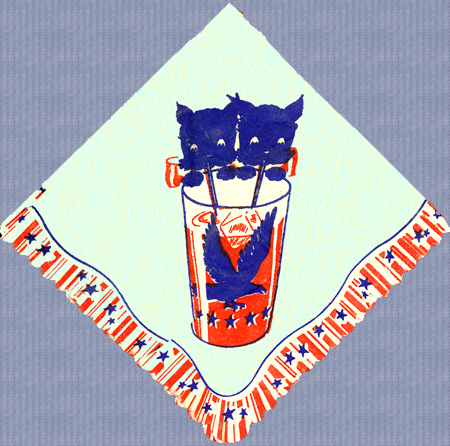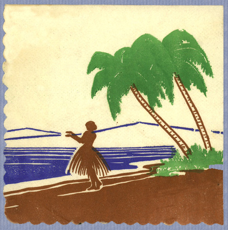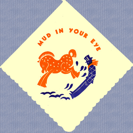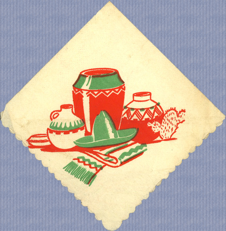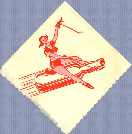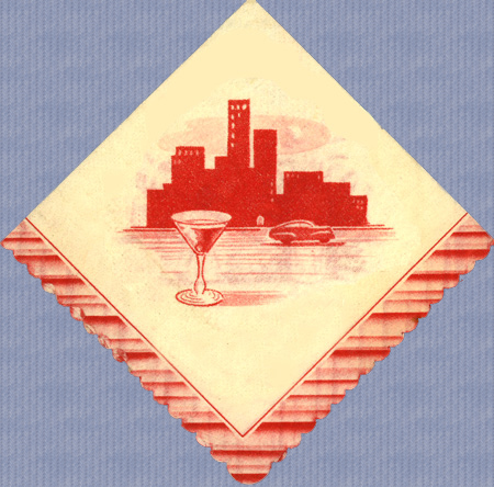 But this week I thought I’d take a look at the front side of some cocktail napkins, lest we forget that not all inspiration and art resides on the back side. All of these are from a scrapbook I came across that belonged to a couple who saved cocktail napkins as mementos of evenings out and travels across the country. On the back of each of these were also written important things: the date and place of the drinking, and the names of other guests at the table.