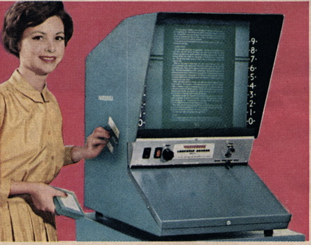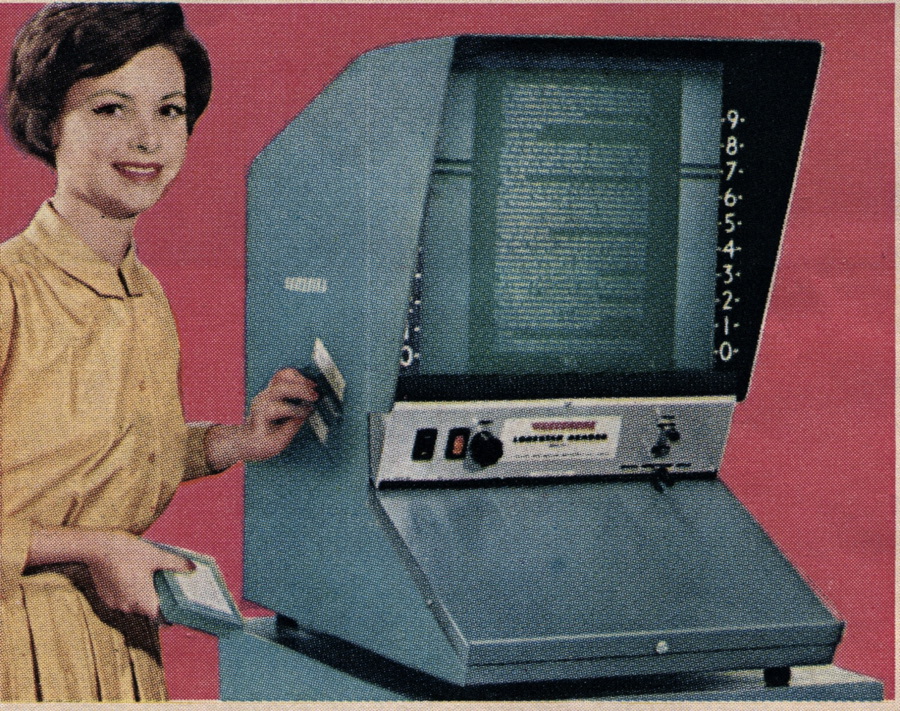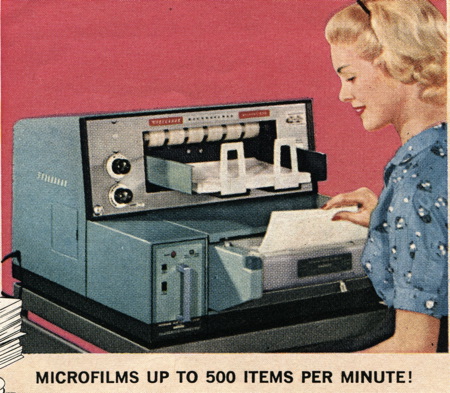 There was no such thing as electronic data storage, so physical record keeping was a big part of the workforce. Here are several images from an ad for microfilm equipment, which was standard issue in most large companies. Huge file rooms were common in basements and darkened storage facilities. Hard copies were the only kind there were.