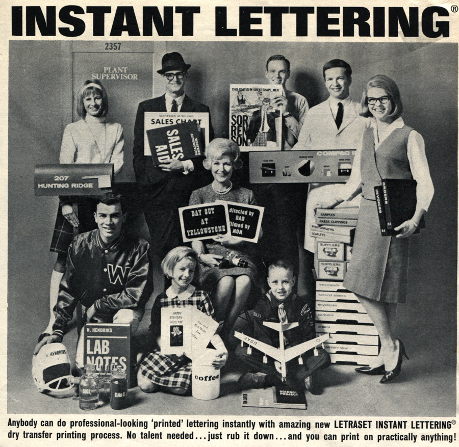I found one interesting novelty ad from 1961. It heralded the introduction of something called “rub-down” lettering from a small company called Letraset. Now, according to the ad, “anyone: could do professional looking printed lettering.”