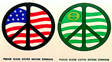The open areas of the peace symbol and its sheer simplicity has lead to many adaptations. Here, from two 1960s matchbooks, are an American flag version and an ecology version.