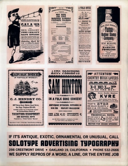In 1962, Solo decided to see if he could make a living from his type collection, which by then numbered about 1,000 unique fonts. He printed 4,000 catalogs, sent them to ad agencies around the country, and waited for the orders to come in. This flyer is from 1962 when the Oakland shop opened.