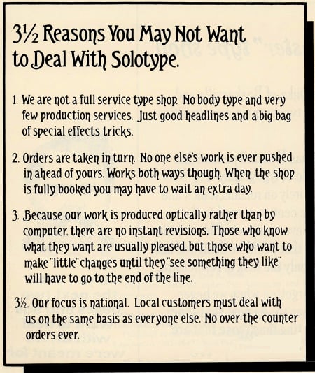 The type designs weren’t the only unusual thing about Solotype. Its business practices and the attitude that Solo fostered were unique. Here are several sections from early Solotype catalogs addressing the way Solo preferred (or insisted) on doing business.
