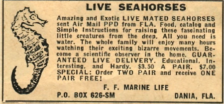 Sea life has also been a point of interest for mail-order purveyors, as seen in this ad for live seahorses from a 1963 issue of Family Circle magazine.