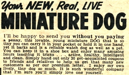 And while Sears may have sold mail-order dogs across America, Dean Studios, a photo-processing laboratory, gave away miniature dogs as a gimmick for ordering photographic reproductions. Here, from 1956, is an ad followed by a close-up of the more interesting copy. Seems these poor little dogs bark just like big dogs, only you can store them in a shoebox.