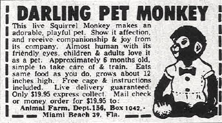 Monkeys make poor pets, I’m told, but that didn’t stop mail-order merchandisers from offering the creatures for sale. These monkeys would be shipped in a box with enough food and water to survive the trip, supposedly, but remember, this was before FedEx and Express Mail. The first ad is from 1967 and suggests that monkeys eat “the same food as you” and even like lollipops!