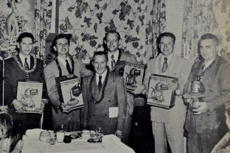 From the looks of things in the newsletter, my dad was a bit of a ham – he appeared in a number of pictures over the years for various reasons. Here he is shown (far right) with some other employees in a country-themed display they set up for Del Monte canned fruits and vegetables, posing as a cow poke. And below that are two pictures of my dad receiving gifts for various accomplishments – first a radio and then (second from the right) a coffee maker.